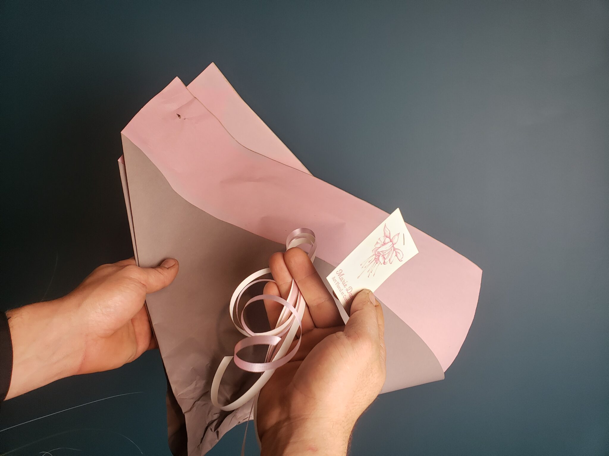Commencez par retirer le bouquet de son emballage. Coupez les rubans qui tiennent le papier seulement, attention à ne pas couper le lien du bouquet lui même. Et voila votre bouquet libéré !