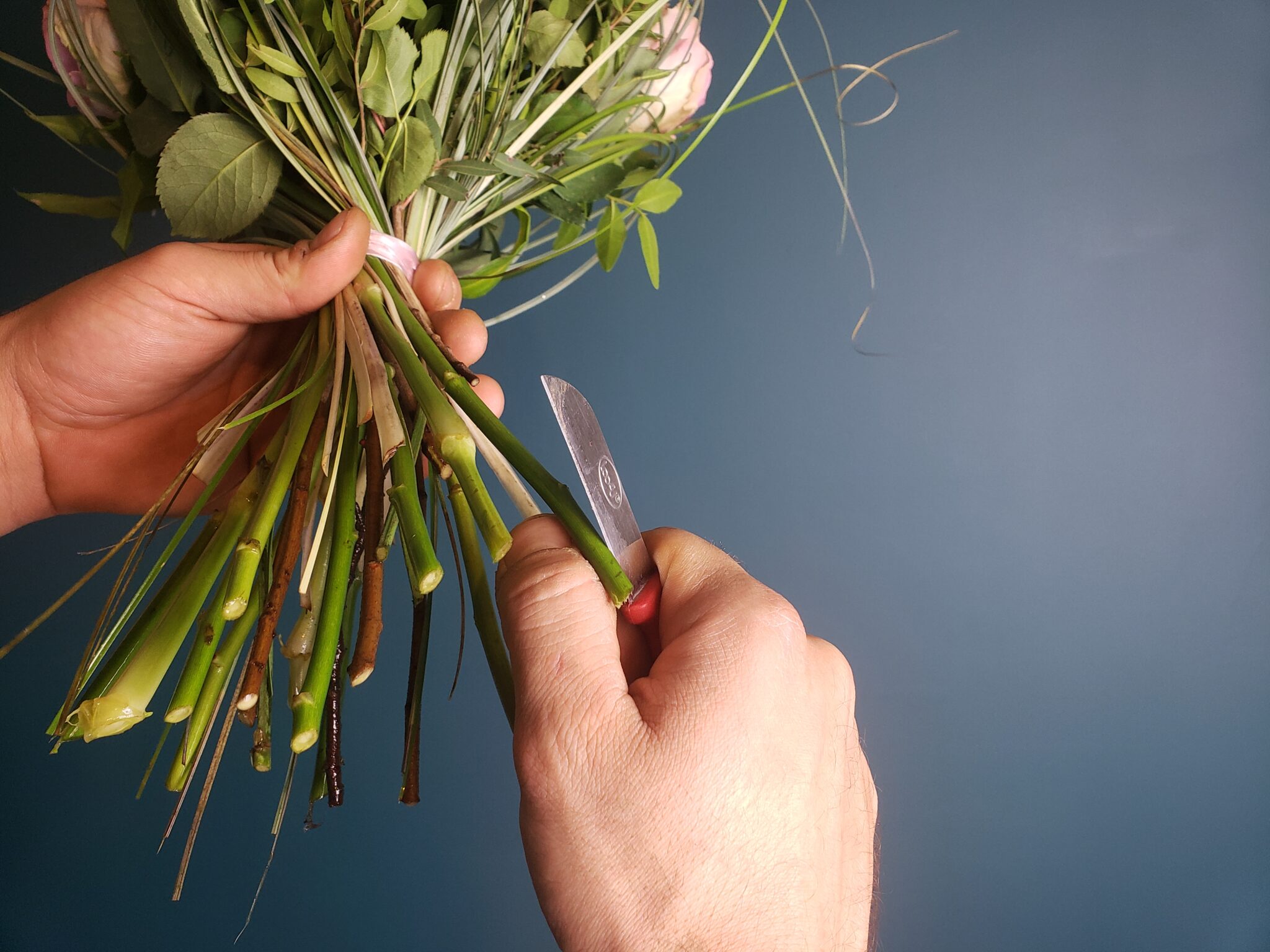 Un sécateur bien aiguisé sera plus pratique pour un bouquet composé, si vous vous lancez au couteau attention à ne pas vous couper ;)