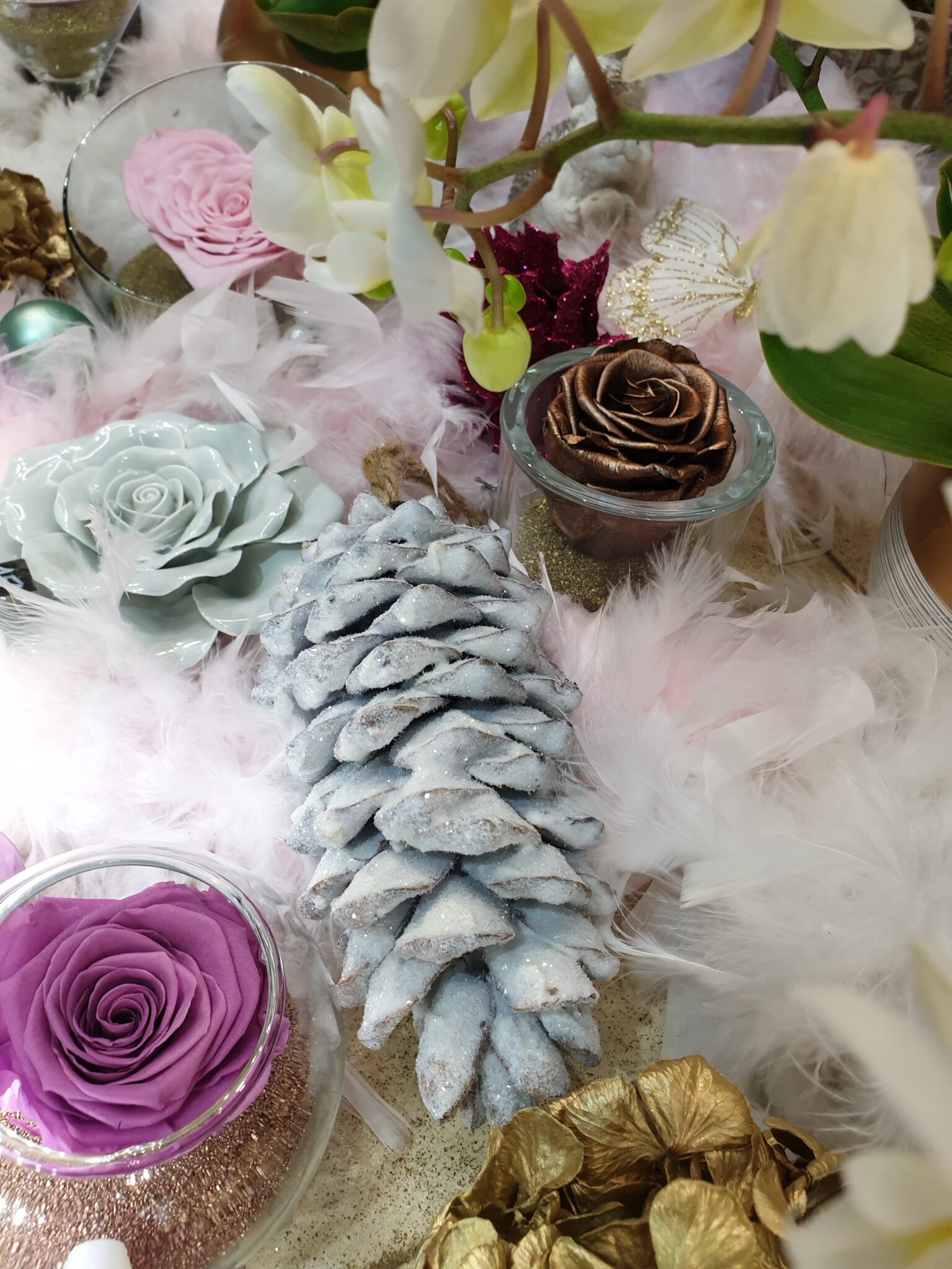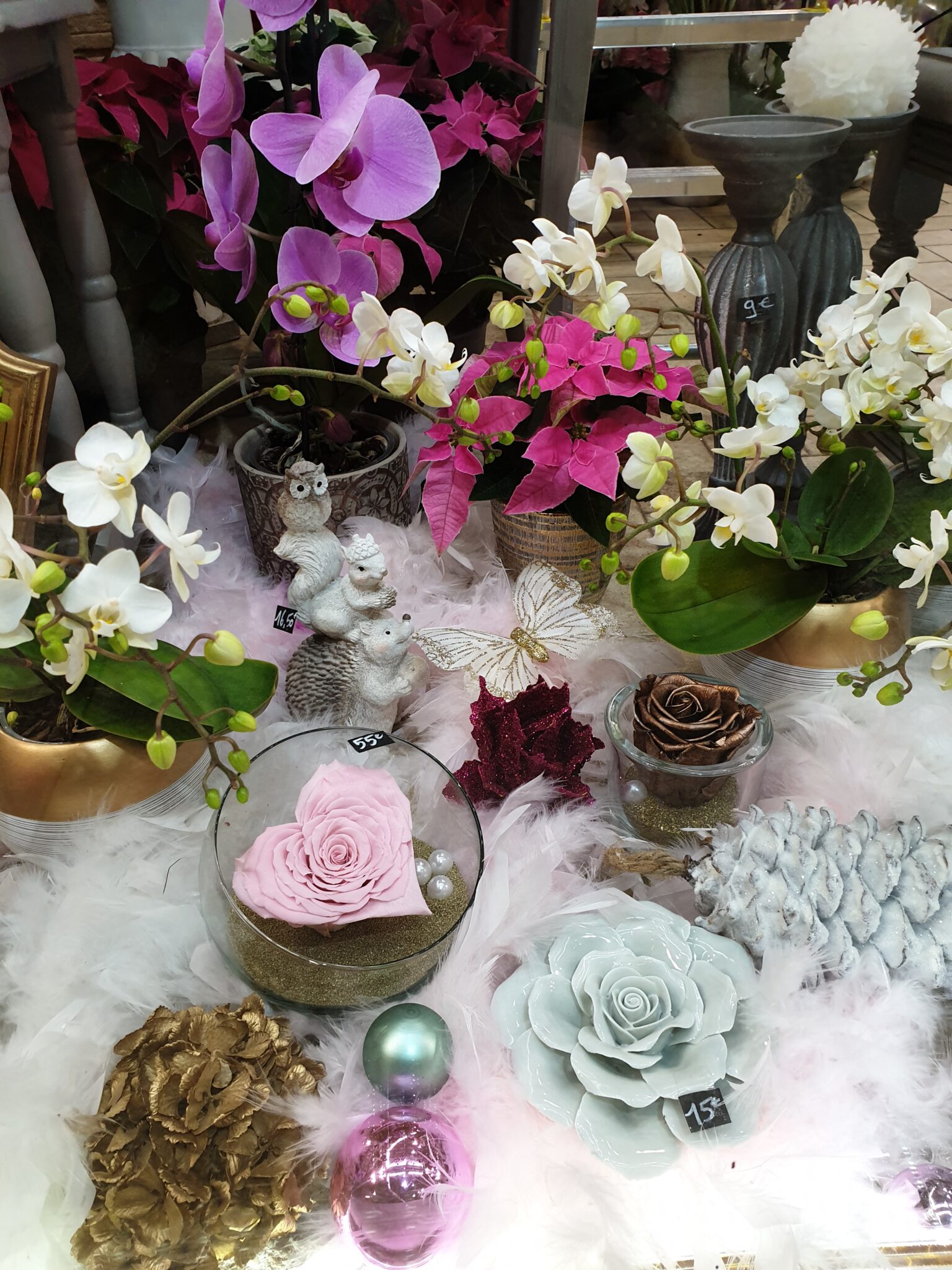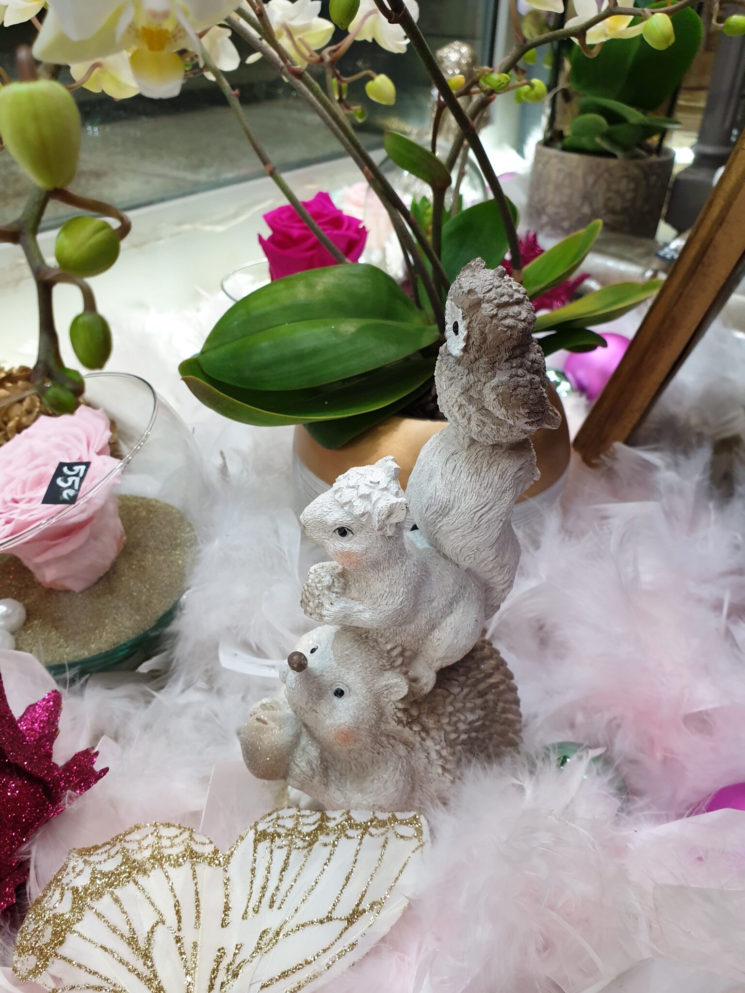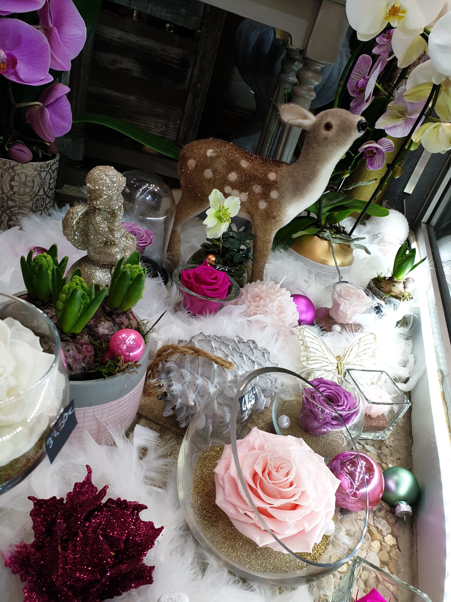 Nos petits amis de la forêt s’invitent tout pailletés et se mêlent à nos roses éternelles, nos orchidées à fleurs géantes et nos poinsettias aussi scintillants pour cette occasion !