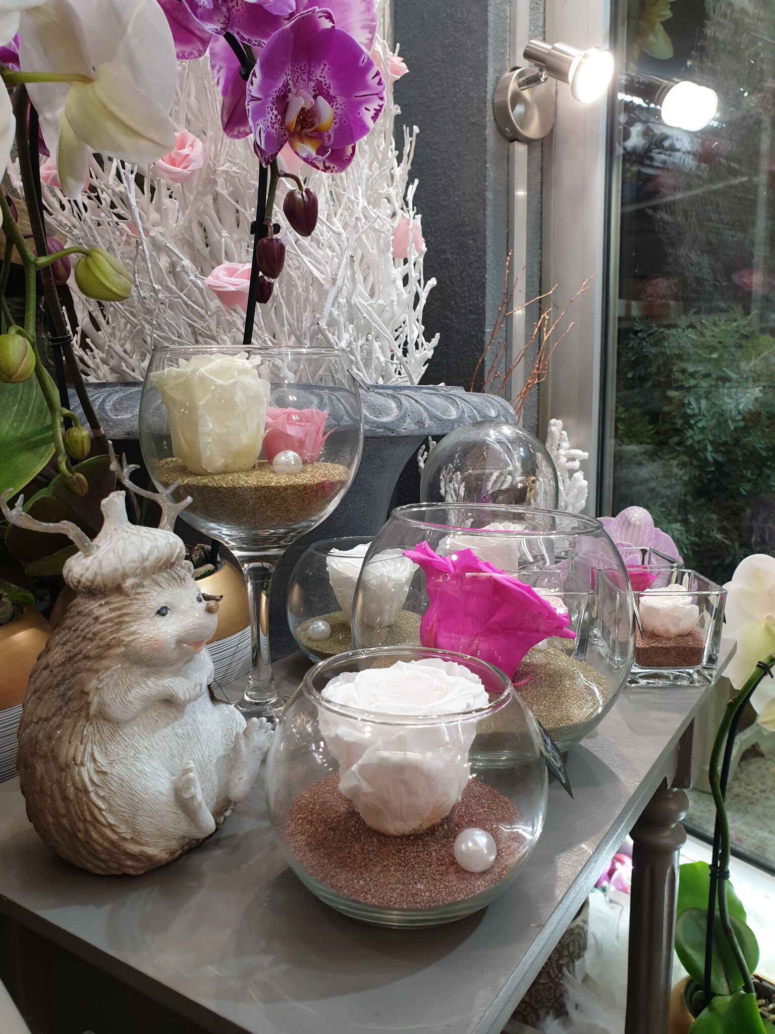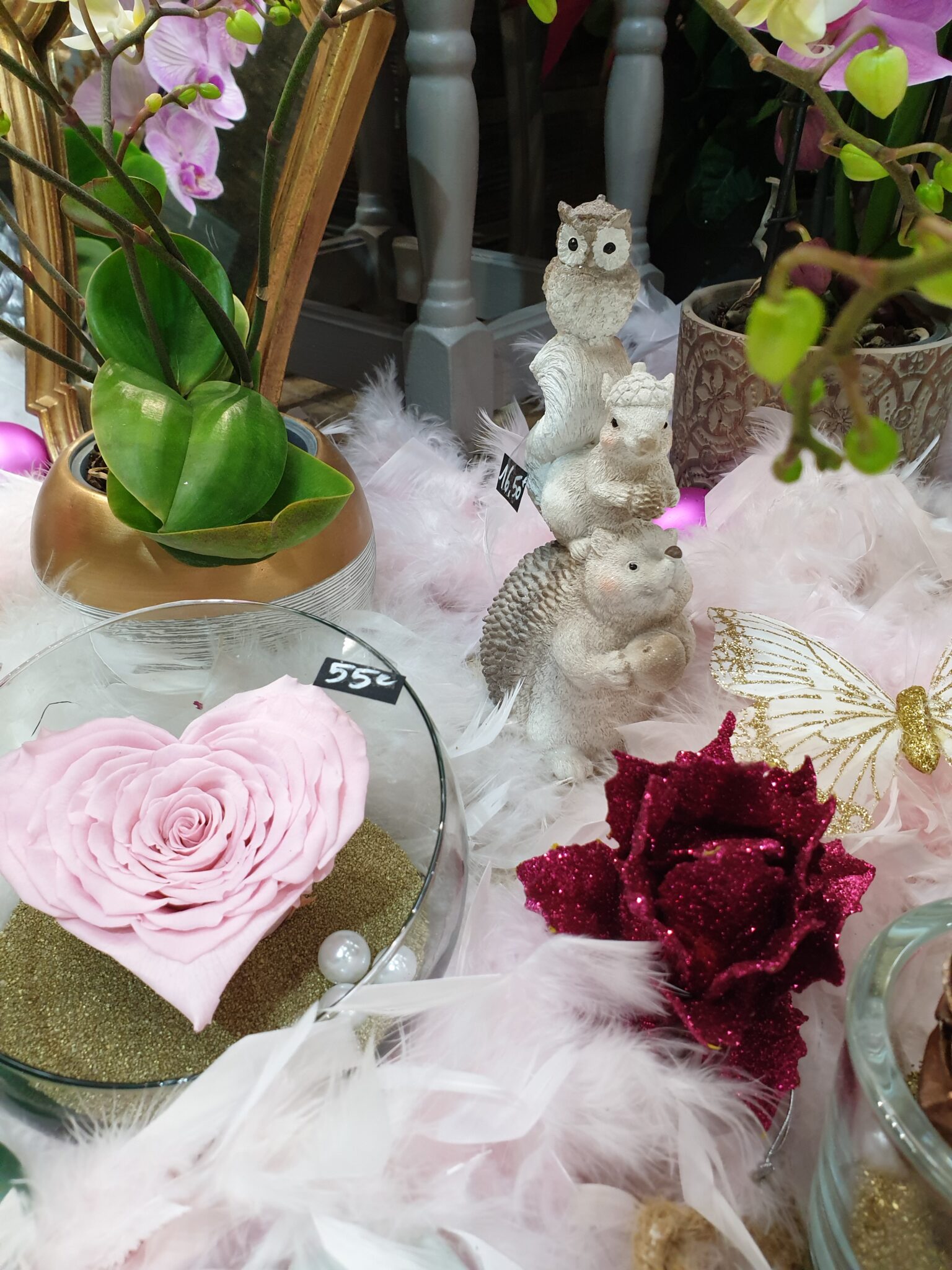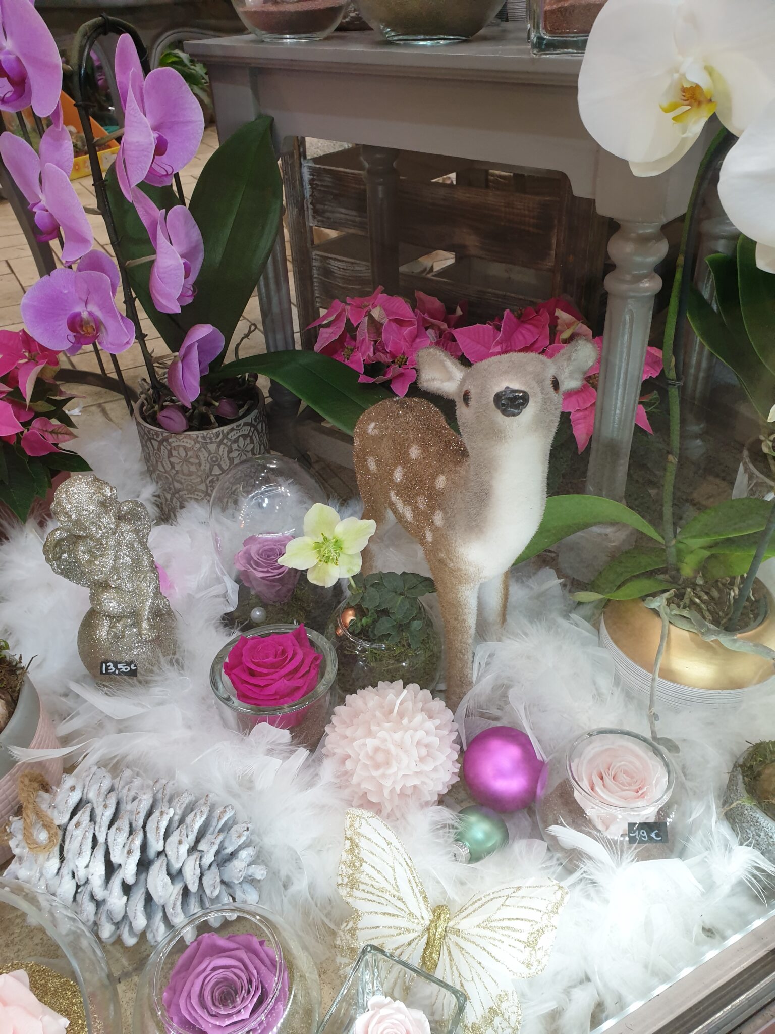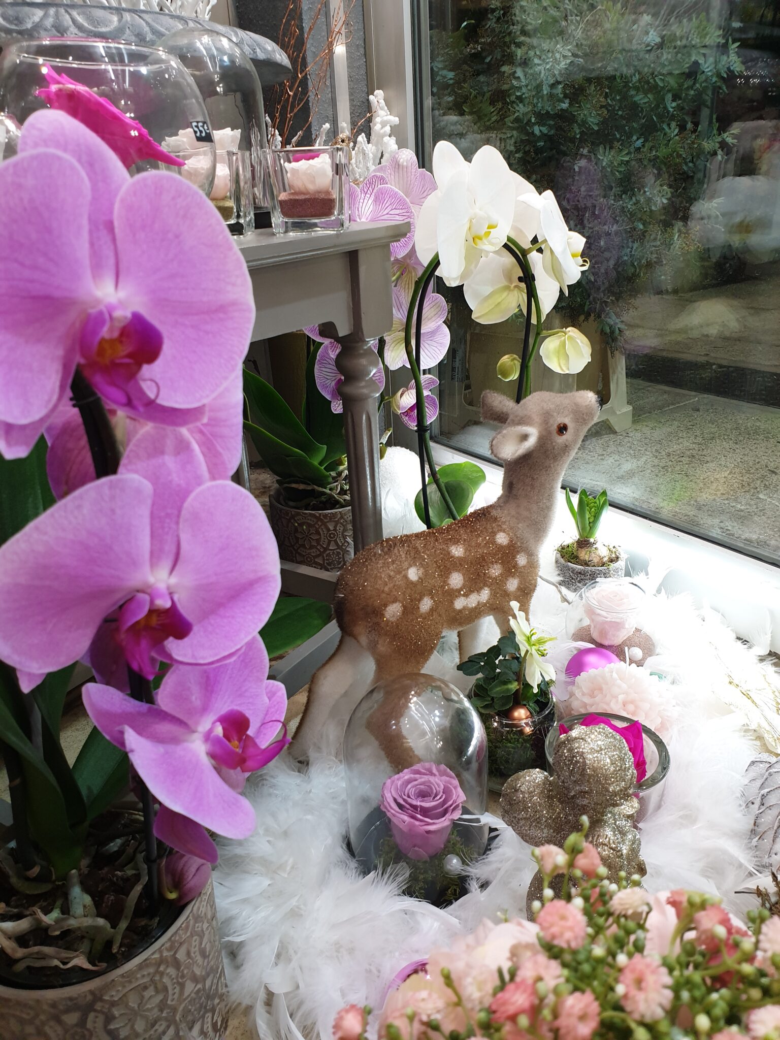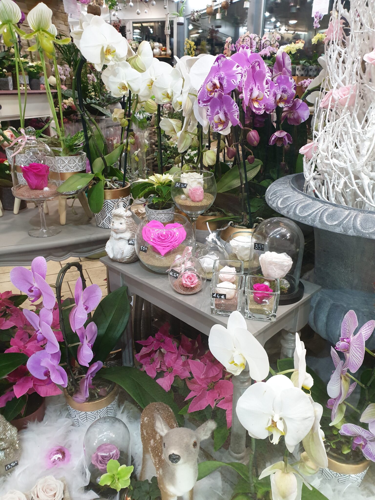 Nos petits amis de la forêt s’invitent tout pailletés et se mêlent à nos roses éternelles, nos orchidées à fleurs géantes et nos poinsettias aussi scintillants pour cette occasion !