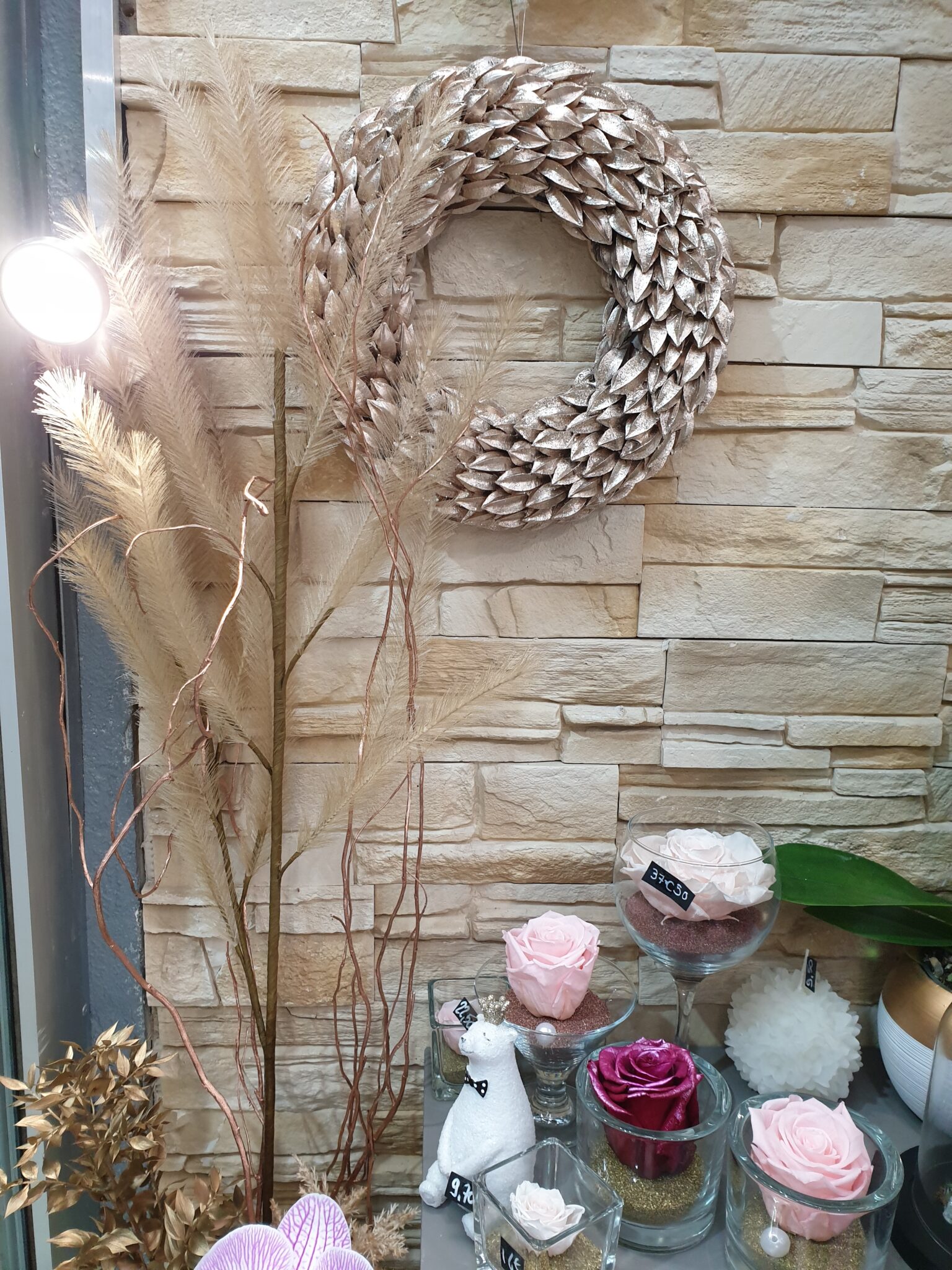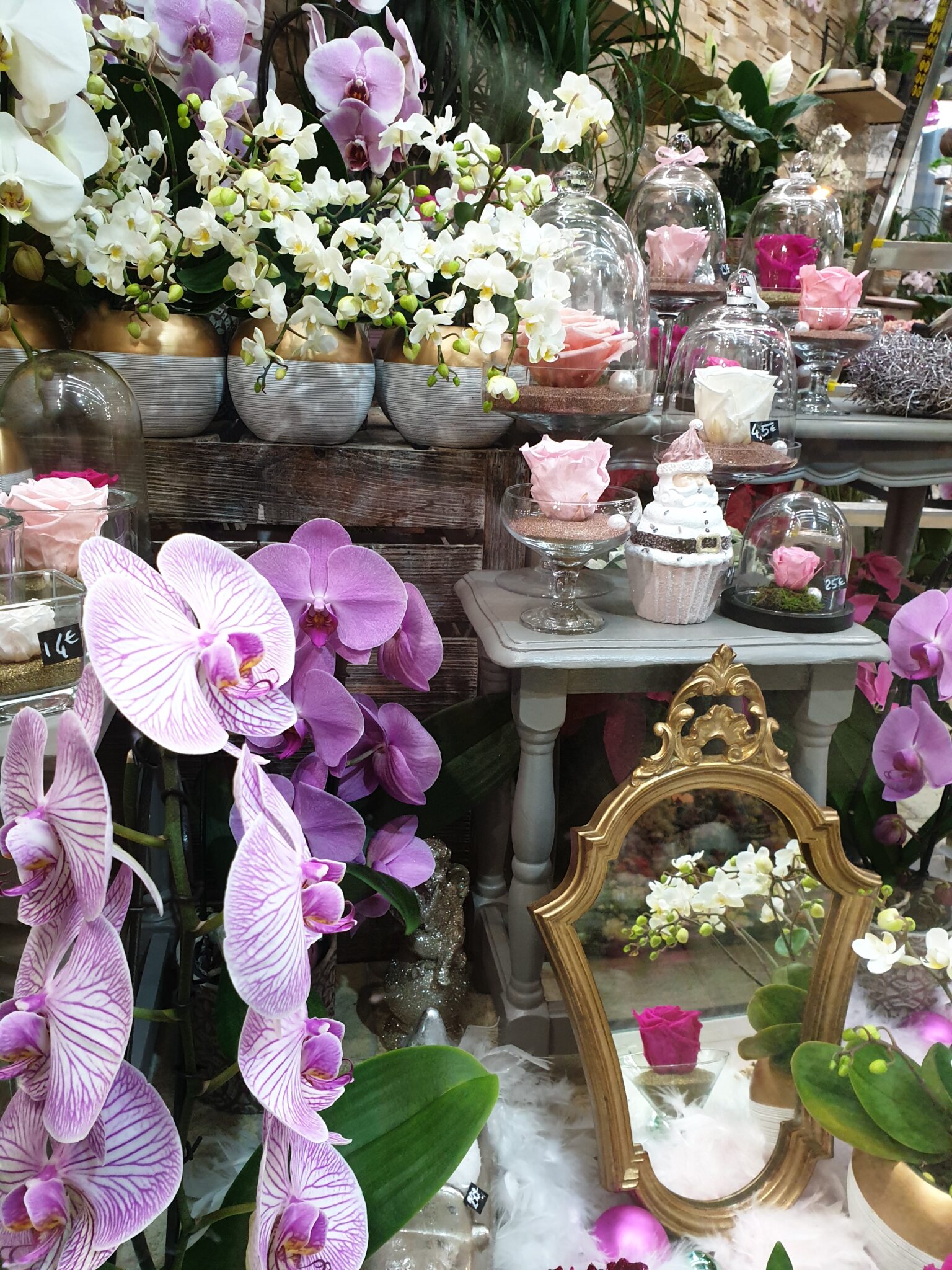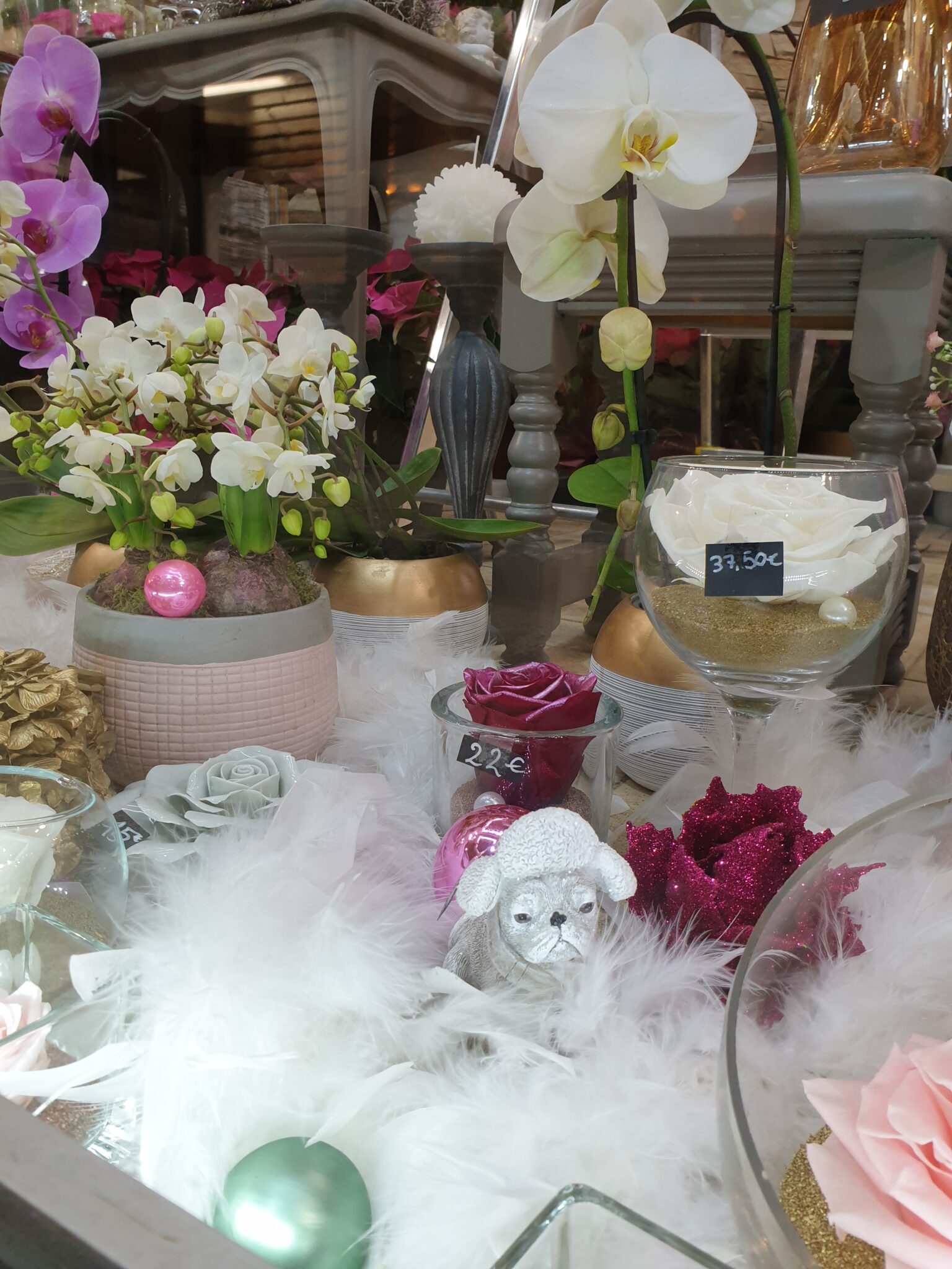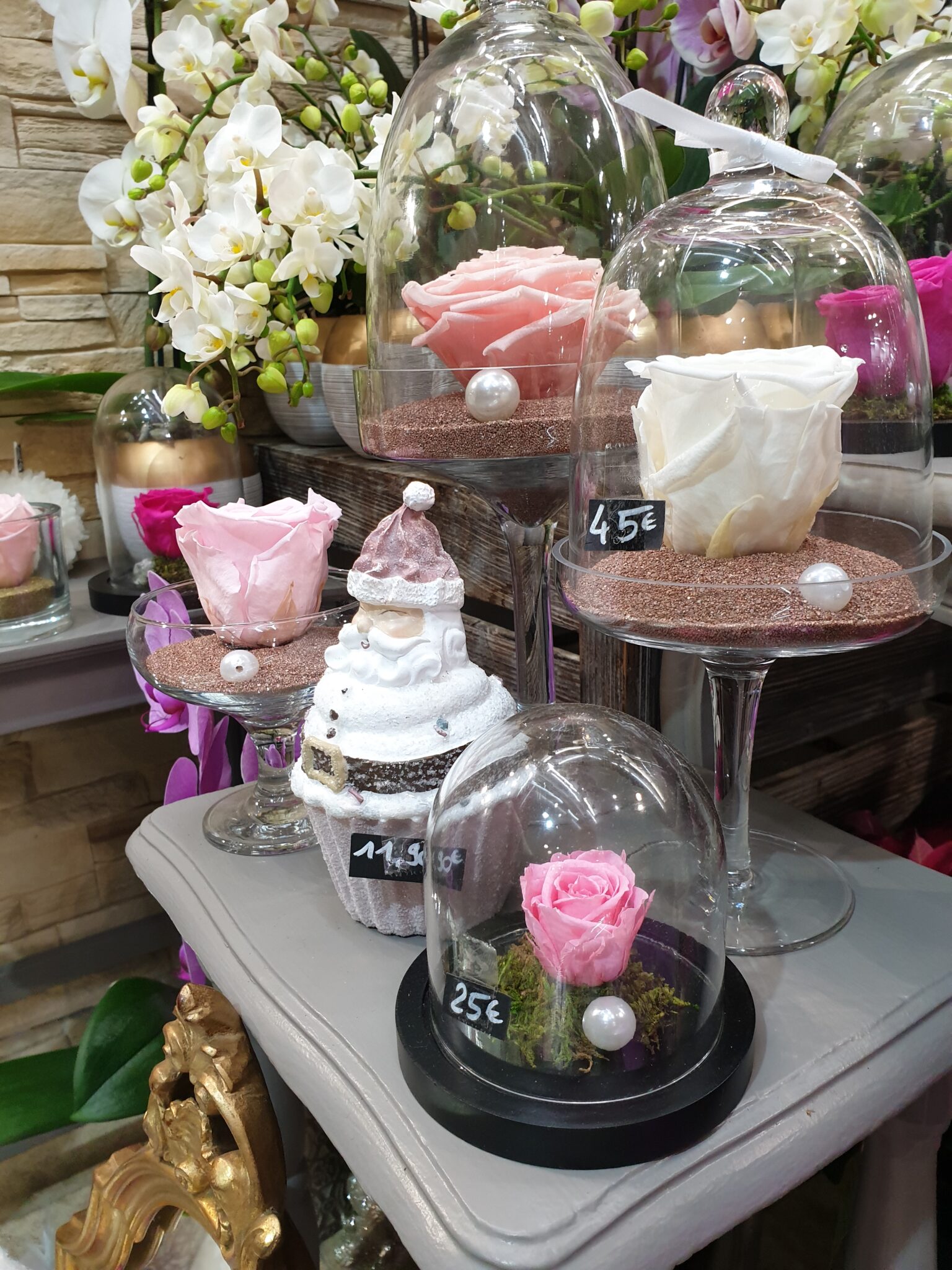 Nos petits amis de la forêt s’invitent tout pailletés et se mêlent à nos roses éternelles, nos orchidées à fleurs géantes et nos poinsettias aussi scintillants pour cette occasion !