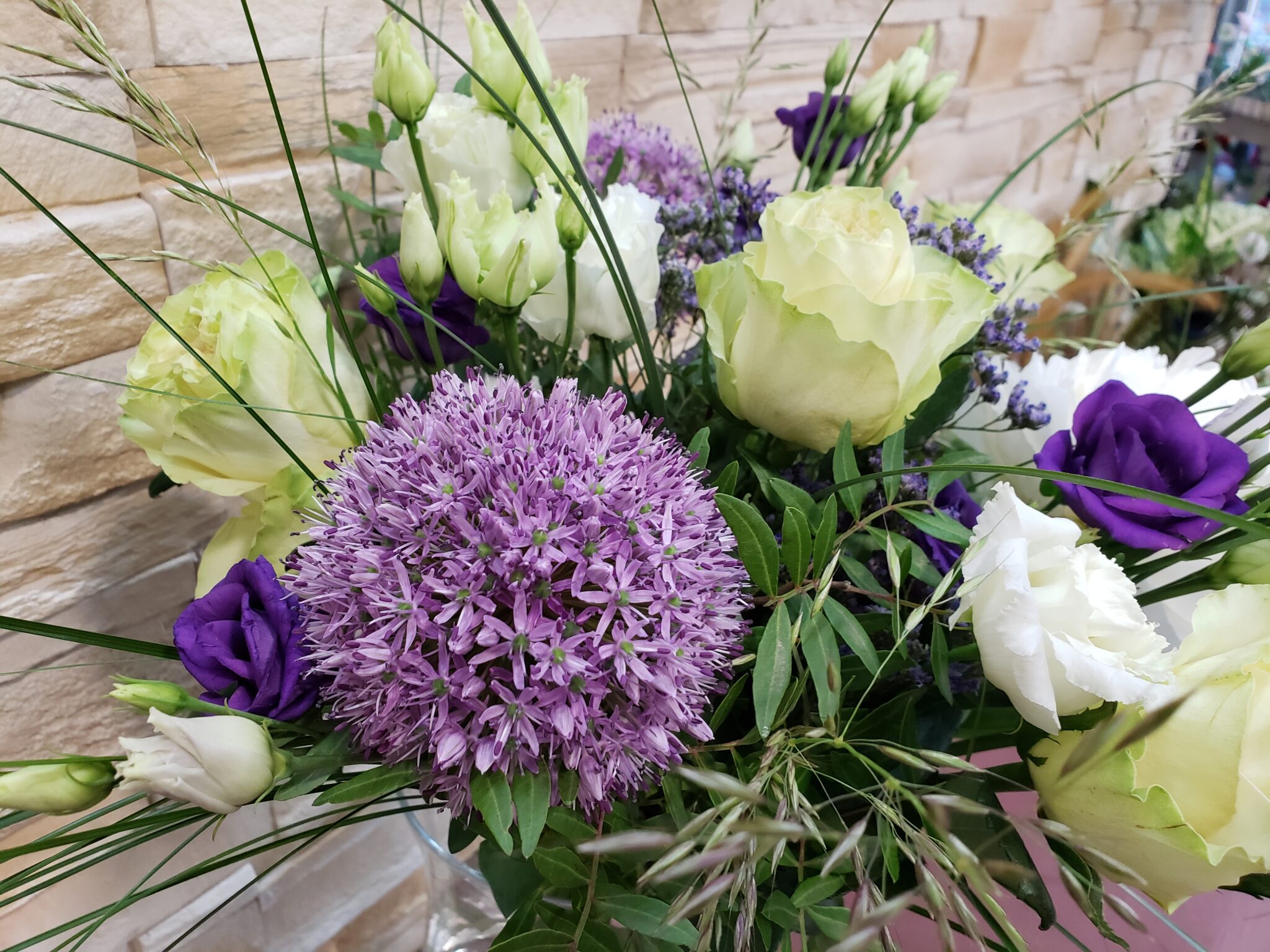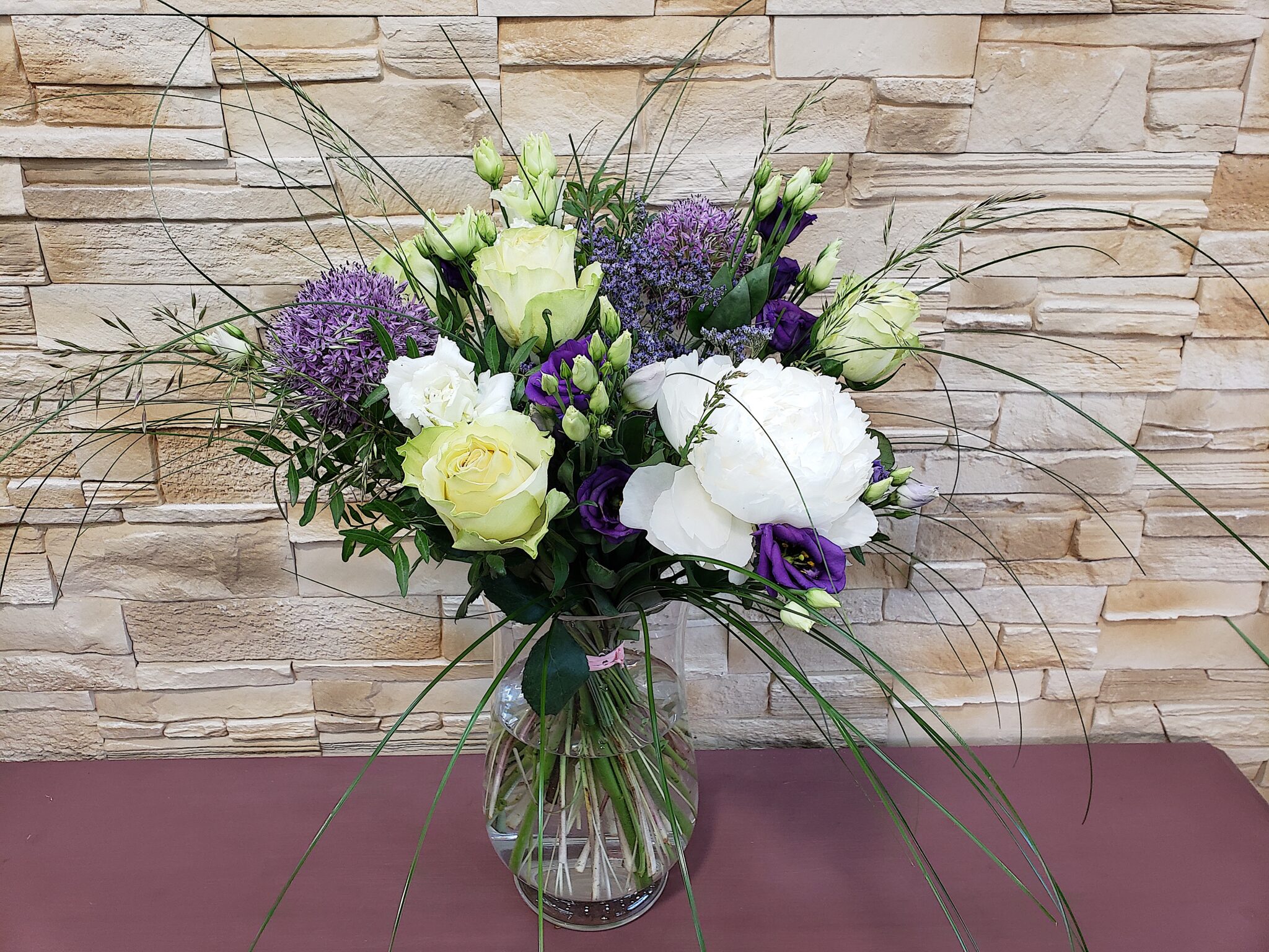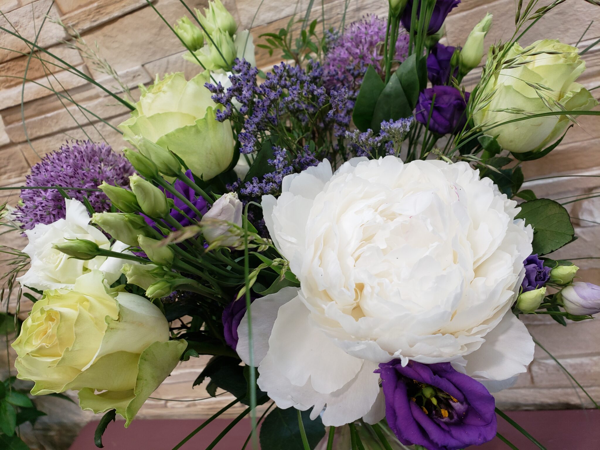 Bouquet champêtre violine composé de superbes pivoines françaises, d’Alliums, de roses, de lisianthus et de feuillage divers.