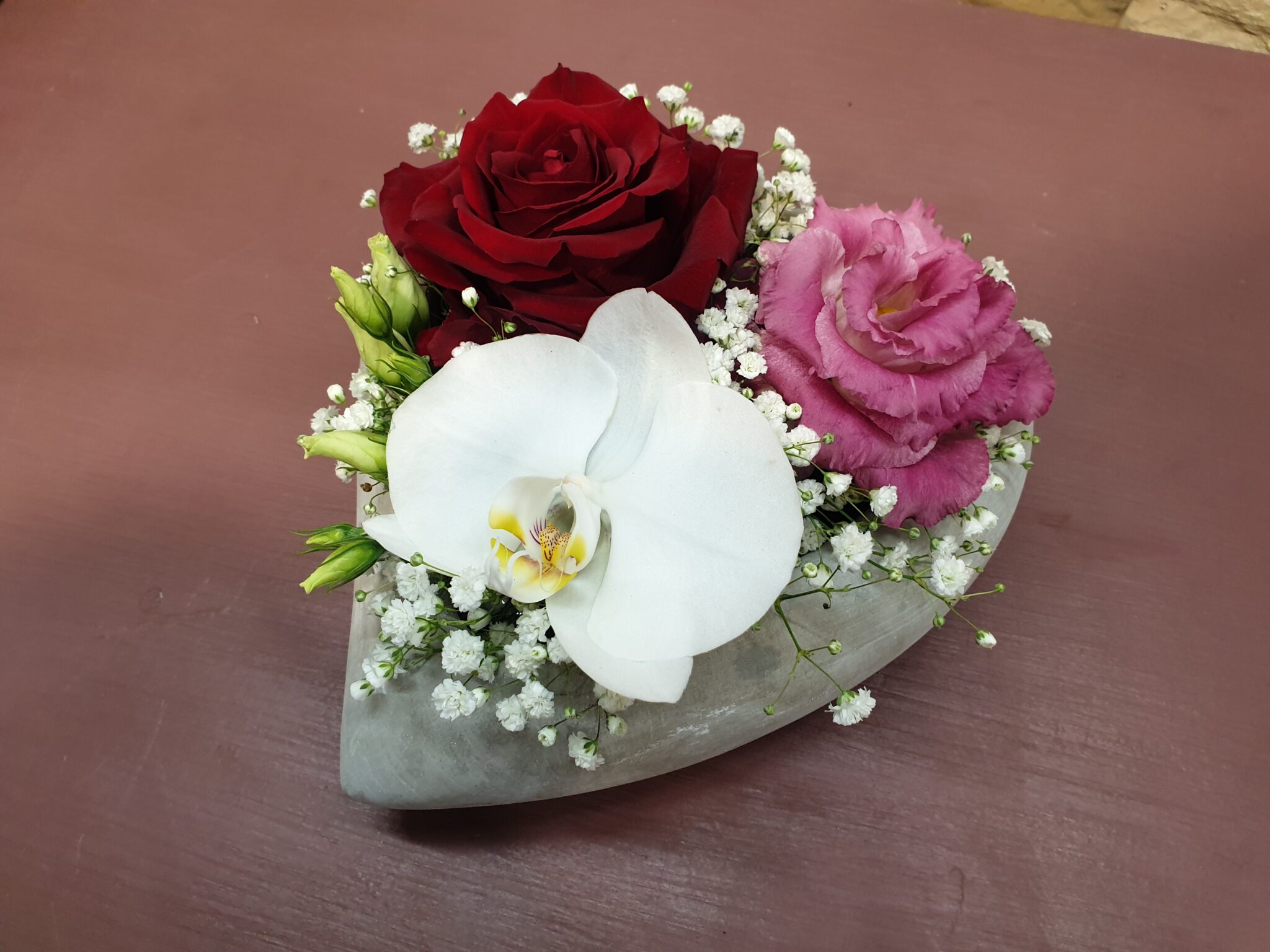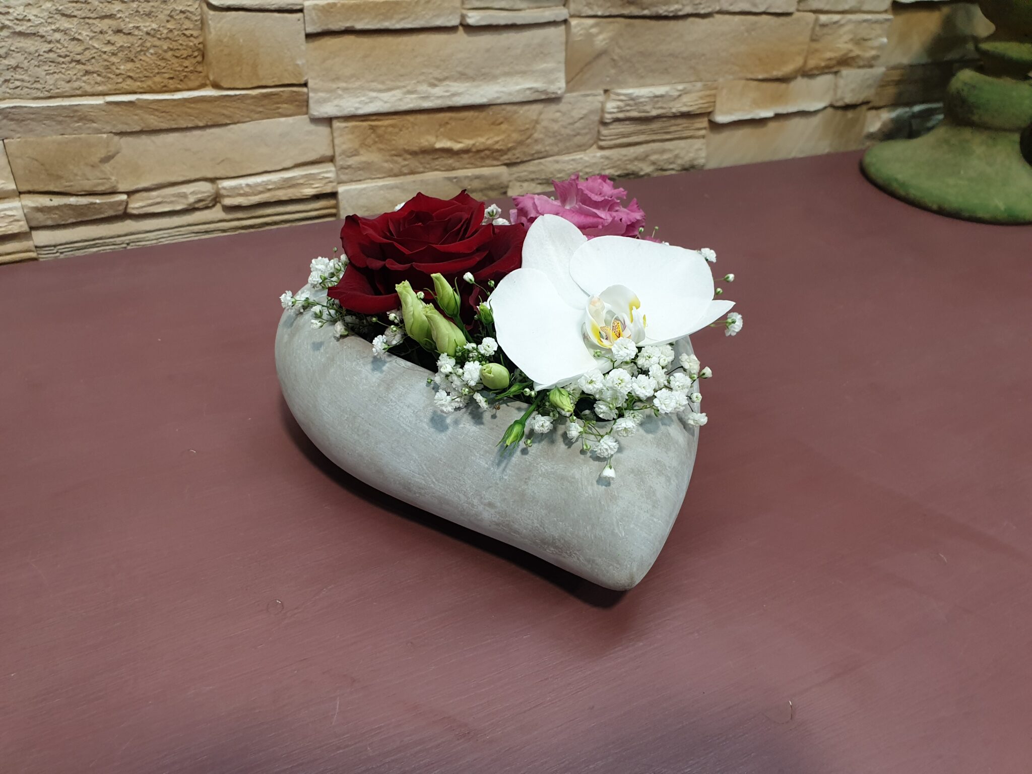 Dites je t’aime et témoignez de vos sentiments avec cette composition florale. Une grande et belle rose rouge, un fleuron d’orchidée et des fleurettes assemblés dans un cœur en ciment.