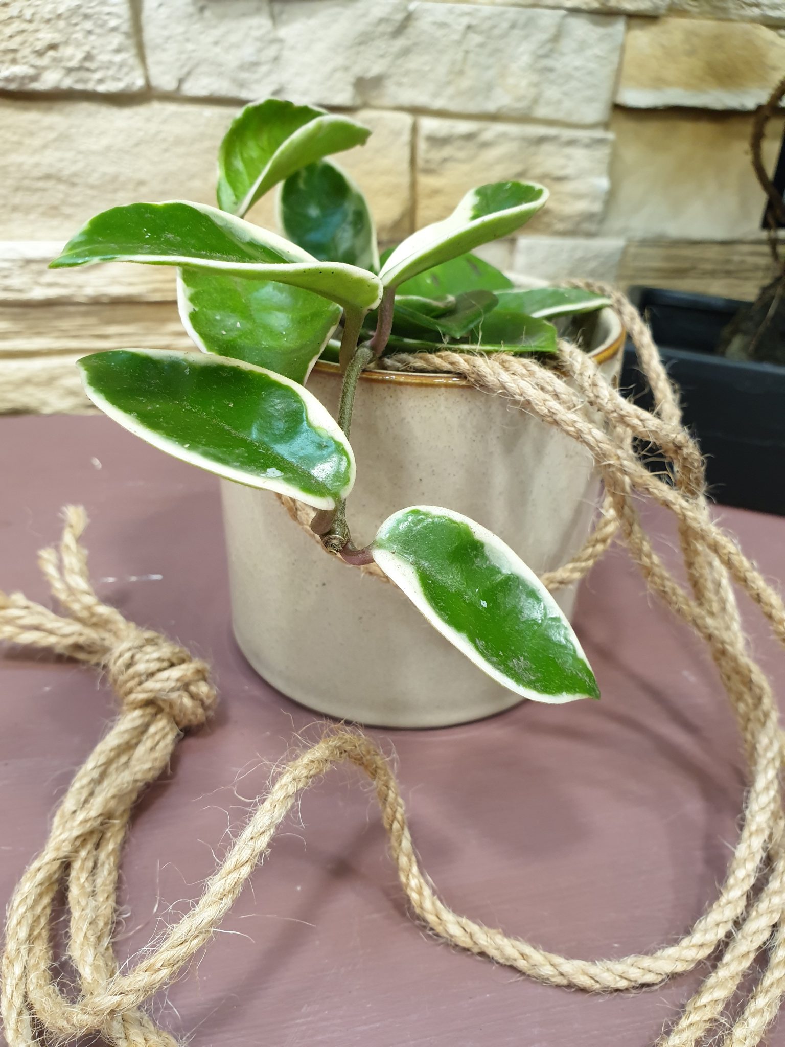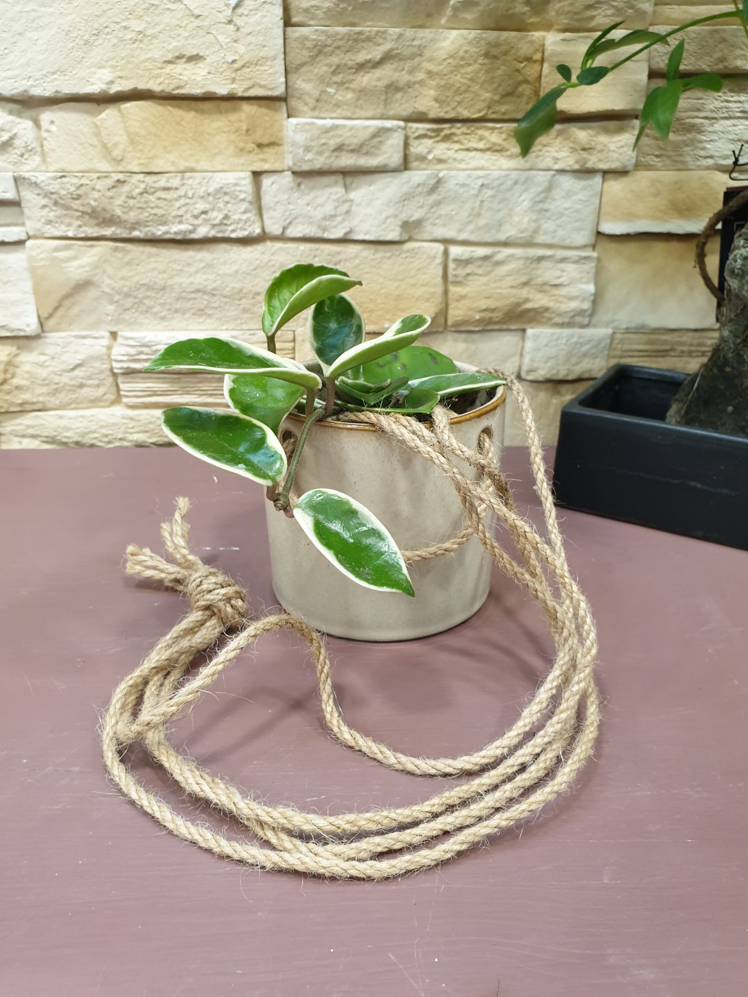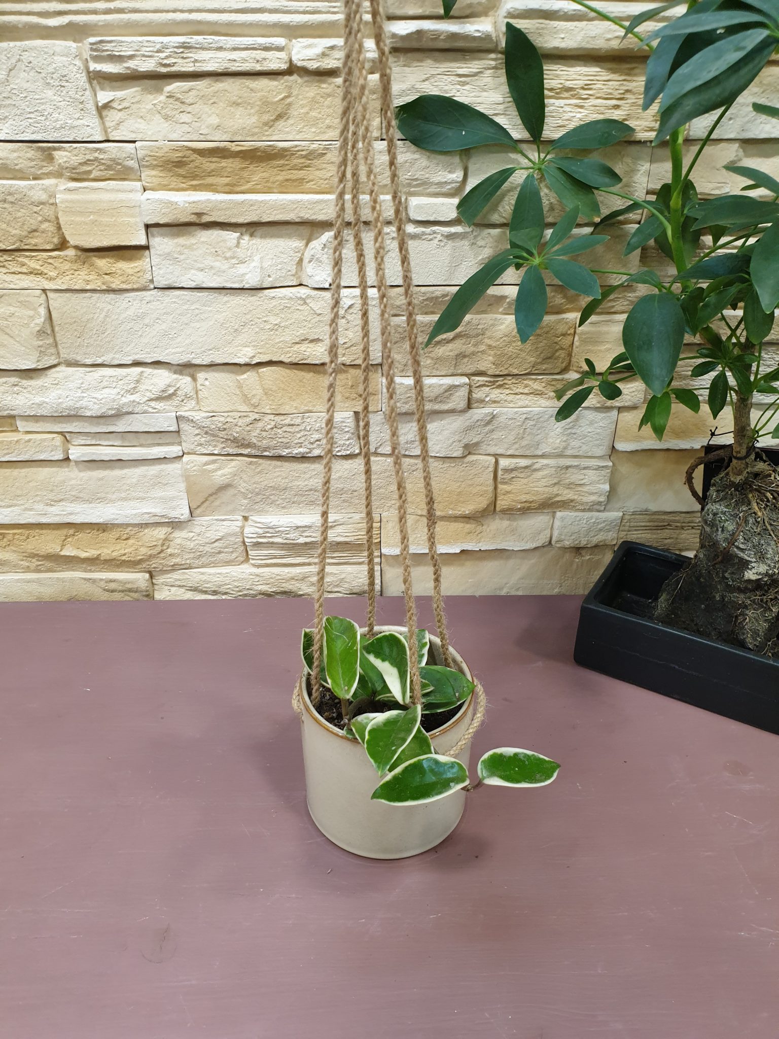 Nous vous proposons nos Hoyas plantés dans des céramiques à suspendre, leur coloris taupe met en valeur le feuillage panaché de cette plante retombante.