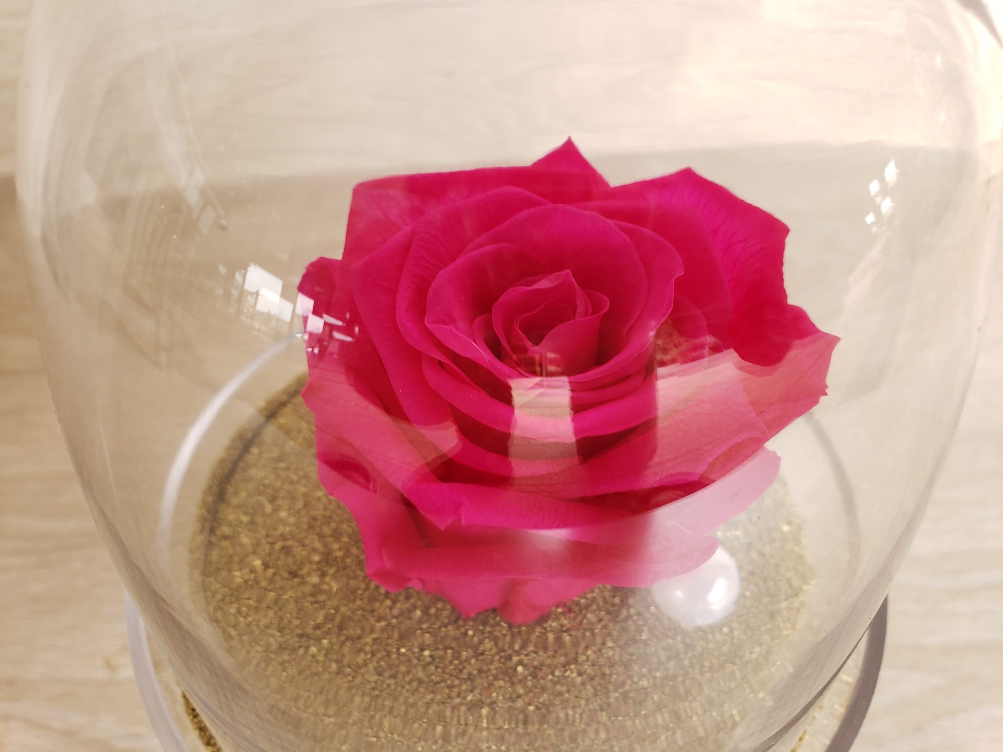 Rose éternelle dans sa cloche en verre sur pied, posée sur un lit de sable fin. (Photo : couleur fuschia)